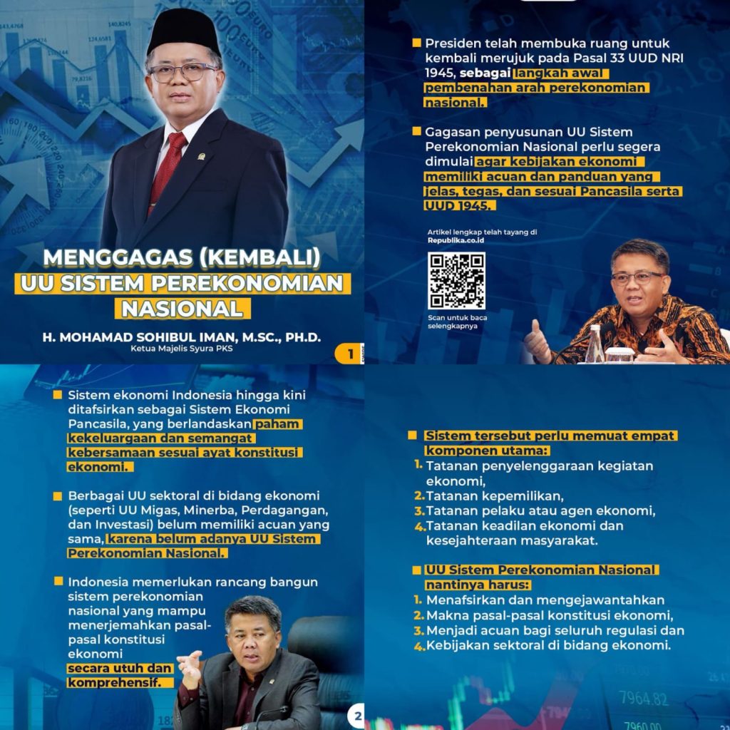 Sohibul Iman menekankan bahwa hingga kini Indonesia belum memiliki Undang-Undang Sistem Perekonomian Nasional yang mengatur perekonomian secara utuh dan komprehensif, padahal Pasal 33 ayat (5) UUD 1945 telah memberi dasar hukum untuk itu. UU ini penting agar seluruh regulasi sektoral—migas, minerba, perdagangan, investasi, dan lainnya—memiliki satu acuan ideologis yang berpijak pada ekonomi Pancasila. Ia menyerukan agar momentum kepemimpinan Presiden Prabowo dimanfaatkan untuk merumuskan UU tersebut, guna mengembalikan arah ekonomi Indonesia ke “jalan lurus” Bung Hatta: ekonomi yang berkeadilan, mandiri, dan menyejahterakan seluruh rakyat.